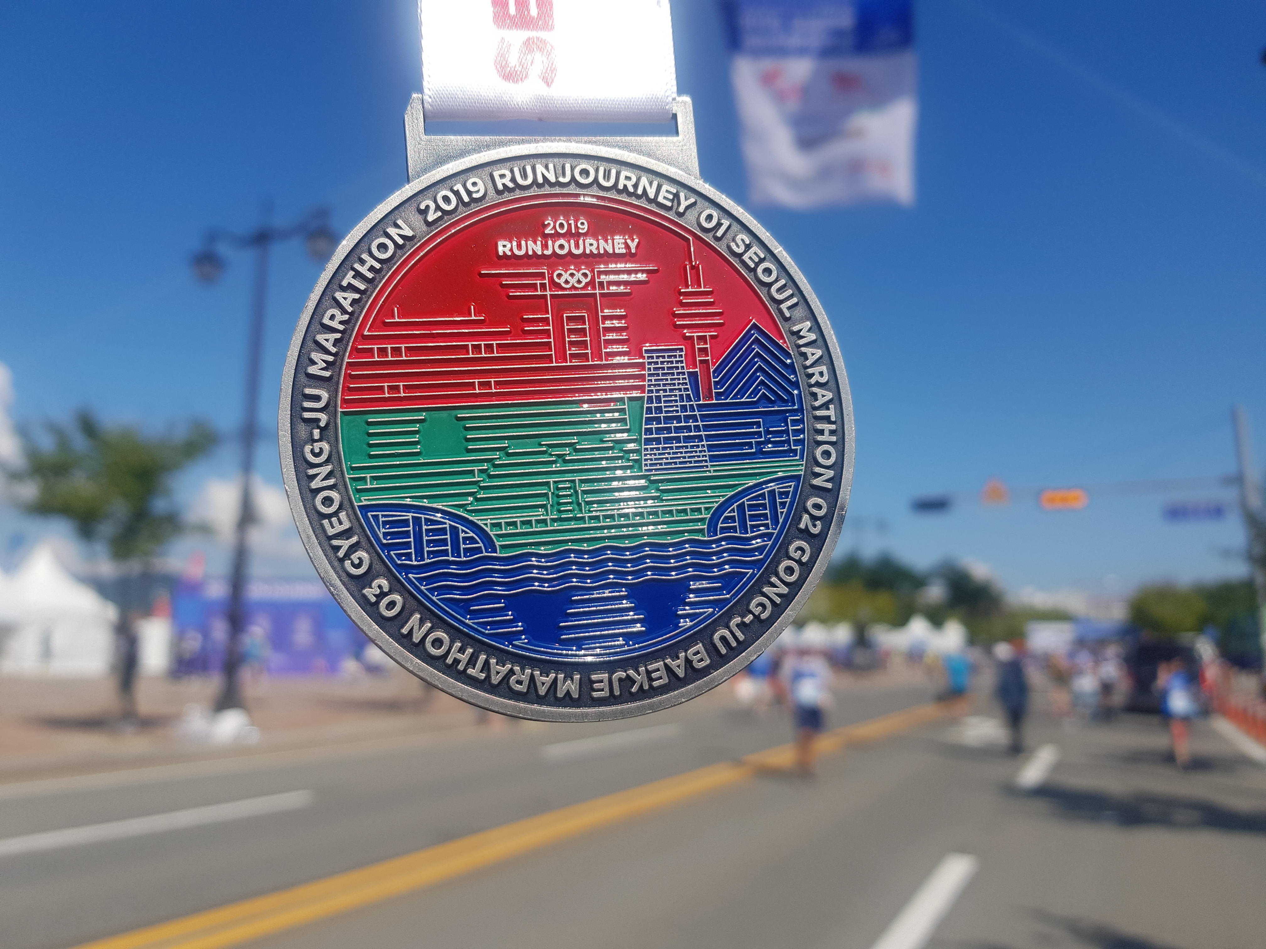 문제의 경주 마라톤 완주 메달. 메달 뒷면, 사진의 오른쪽 메달 2019 아래 GYEOGNJU 가 잘못 표기되어서(원래 GYEONGJU) 메달을 새로 보내준다고 한다. 목걸이는 그대로 쓰고.