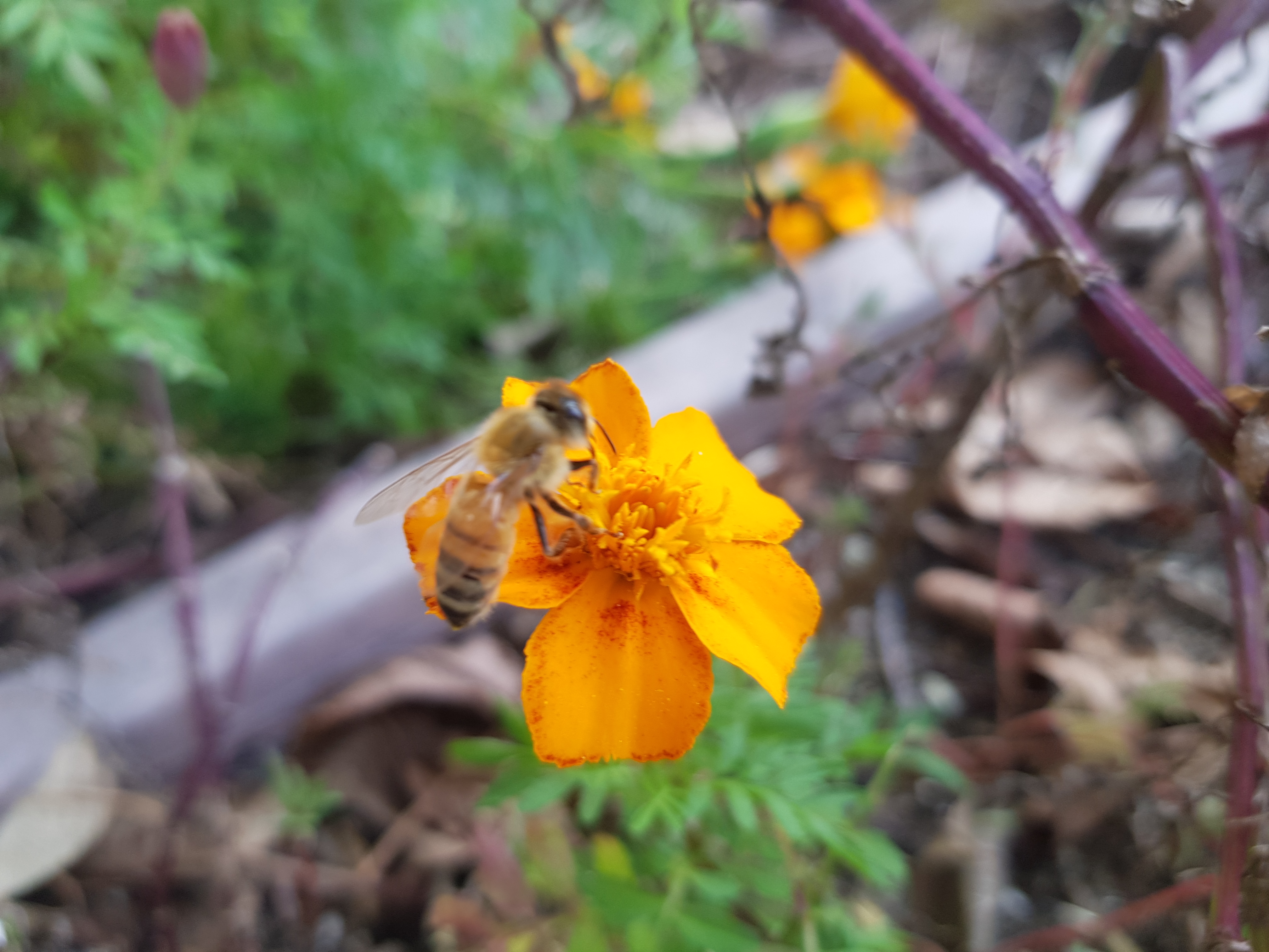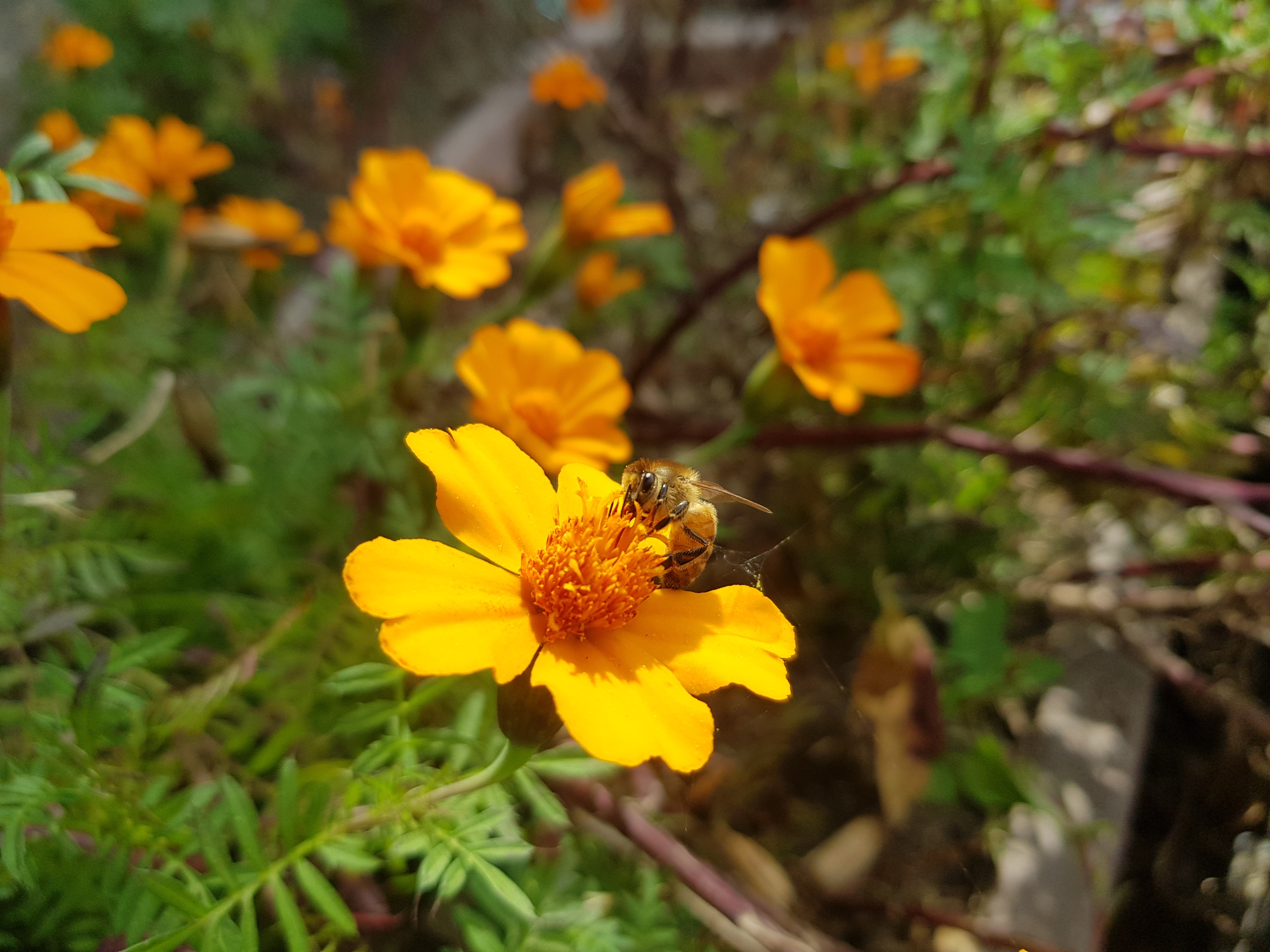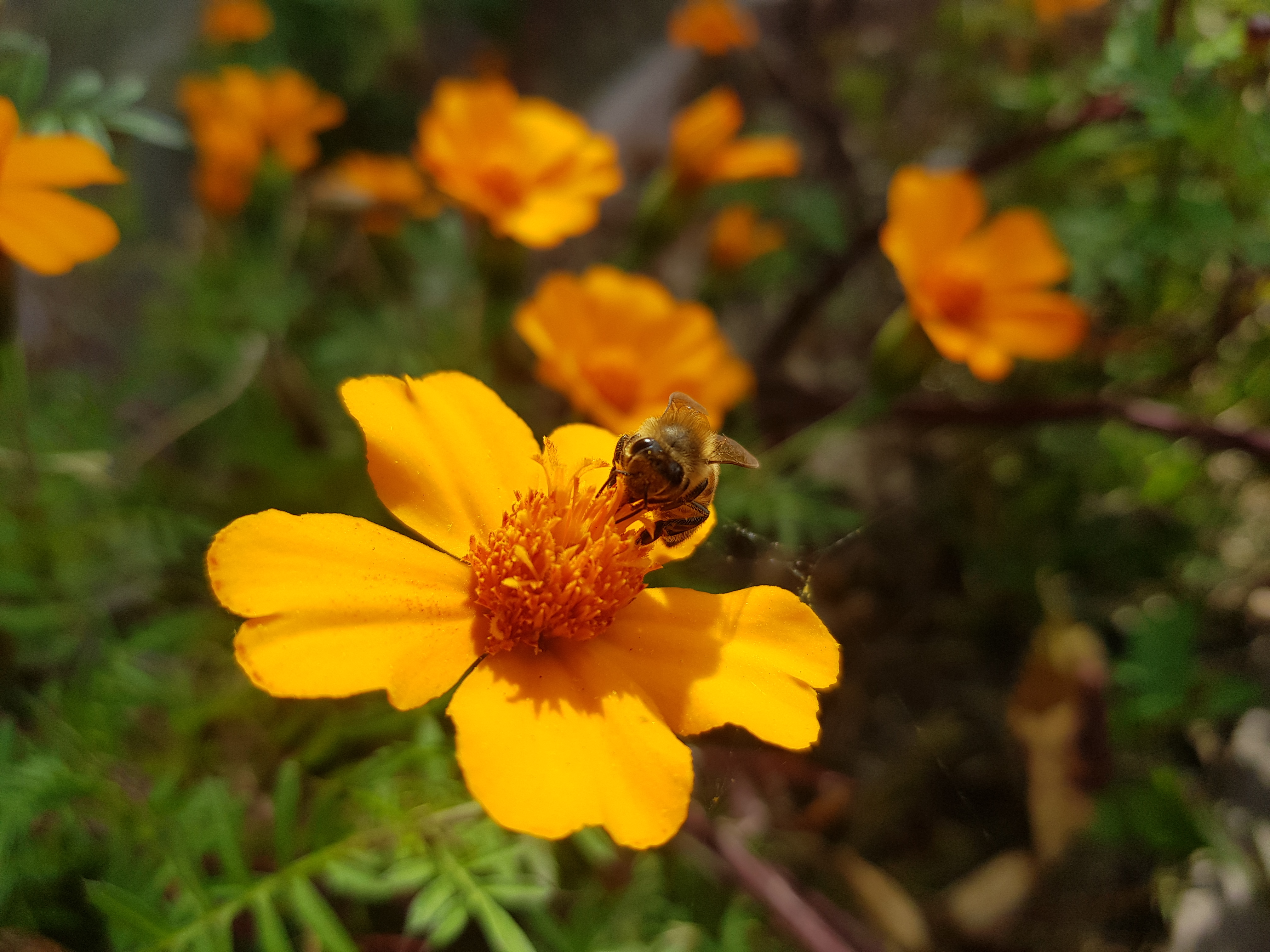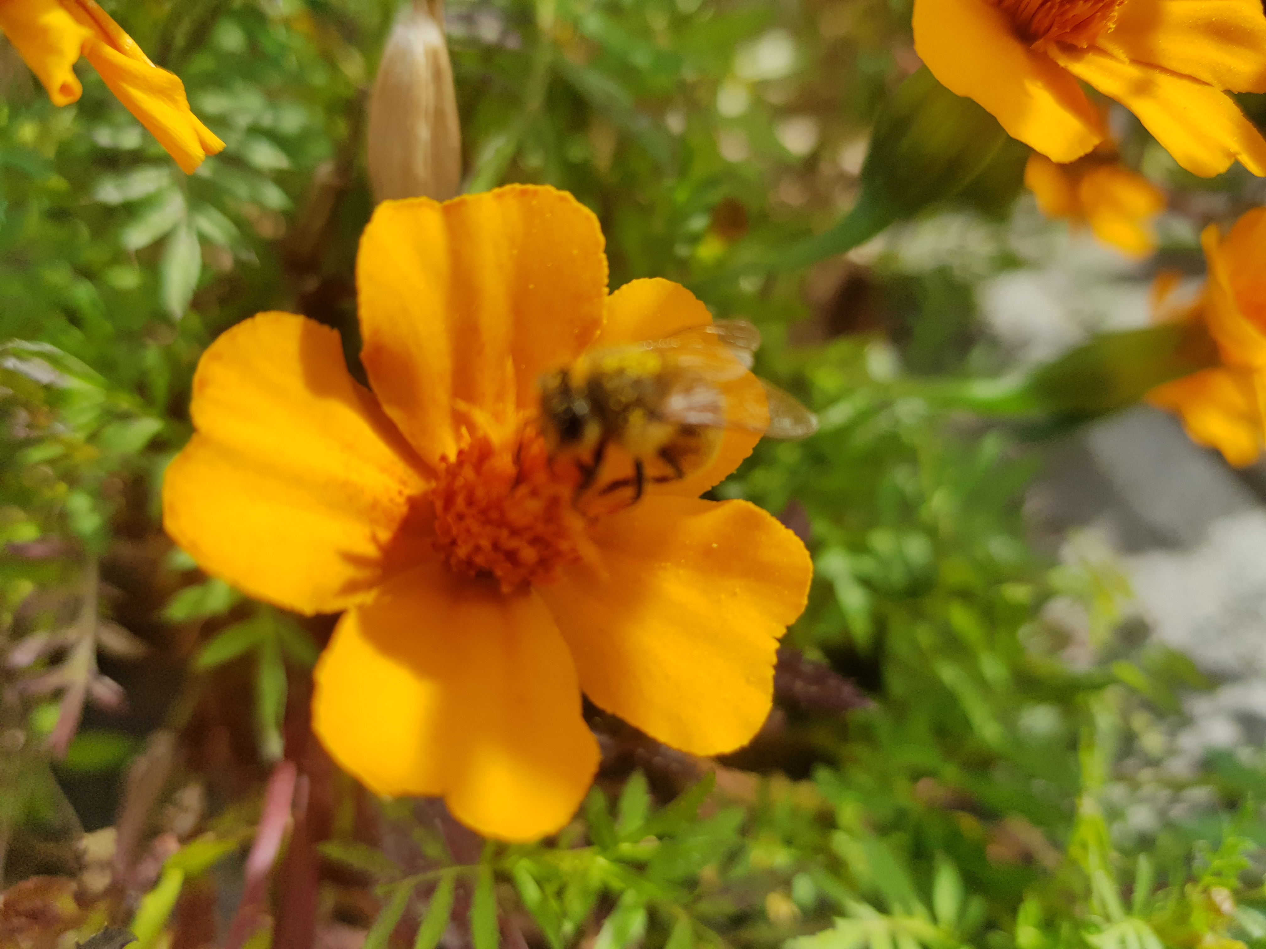 아래 사진은 회사 근처 산책중에 벌들이 주황 코스모스(?) 위에서 바삐 꿀을 따고 있다.-見河-