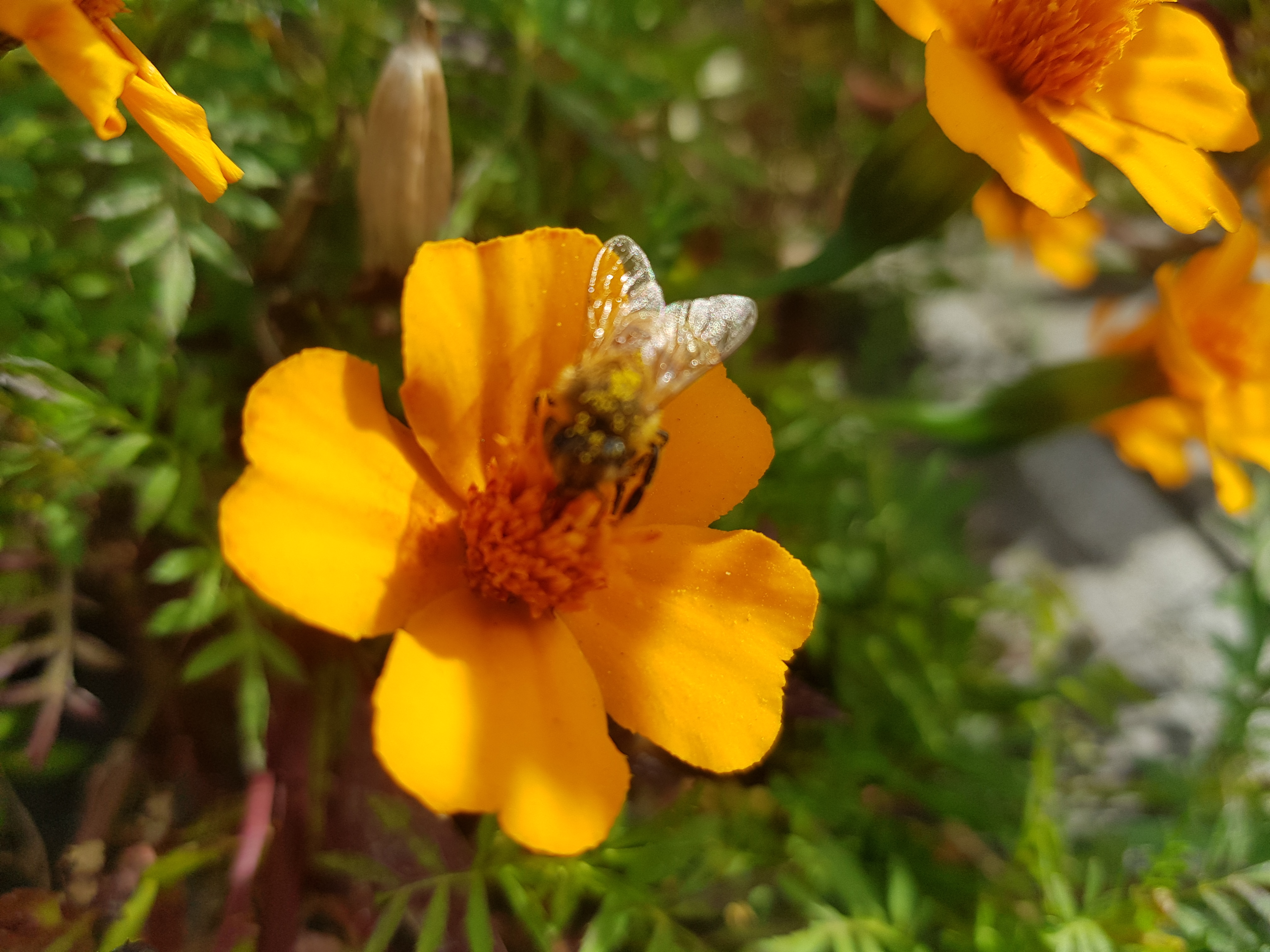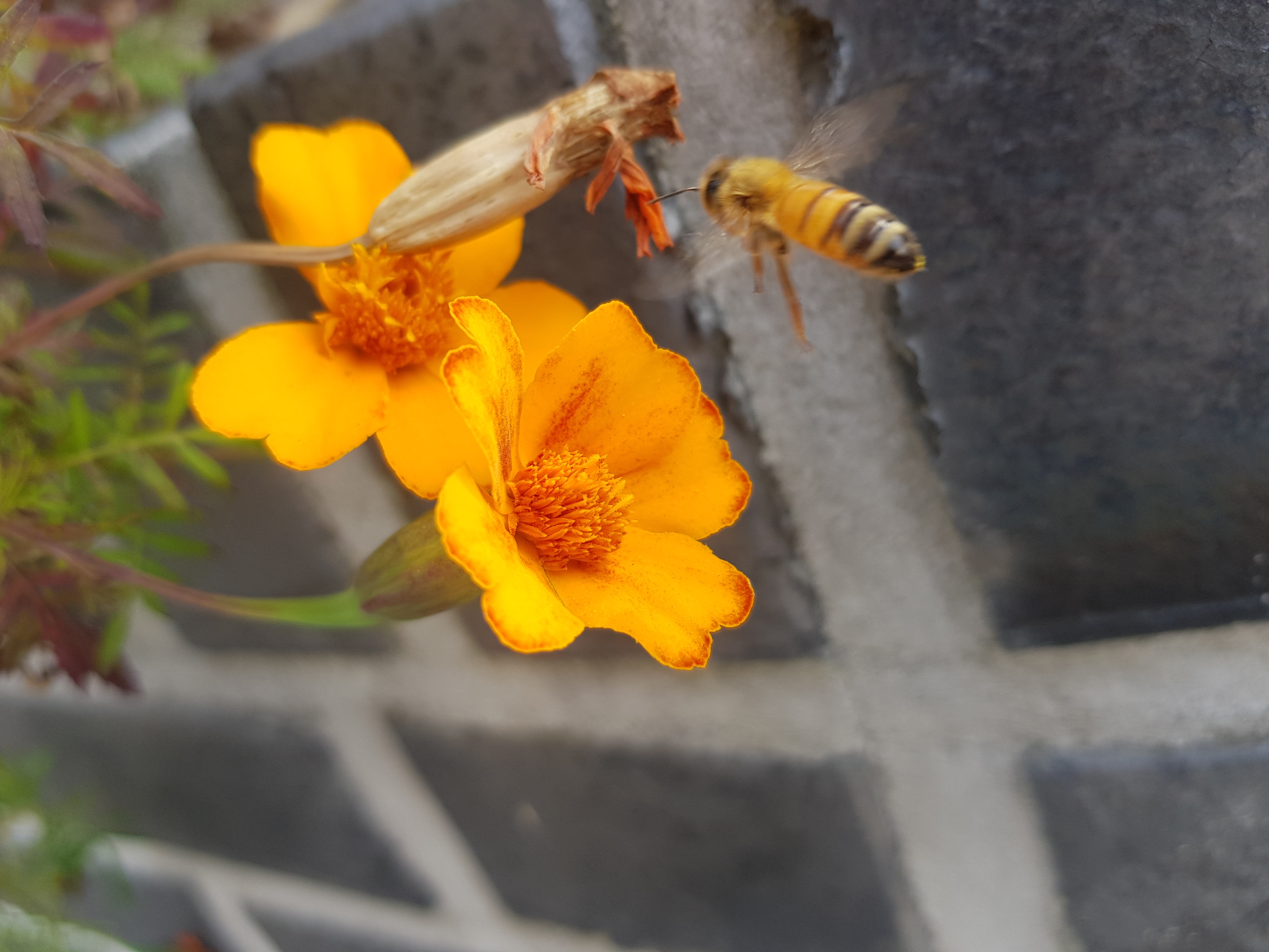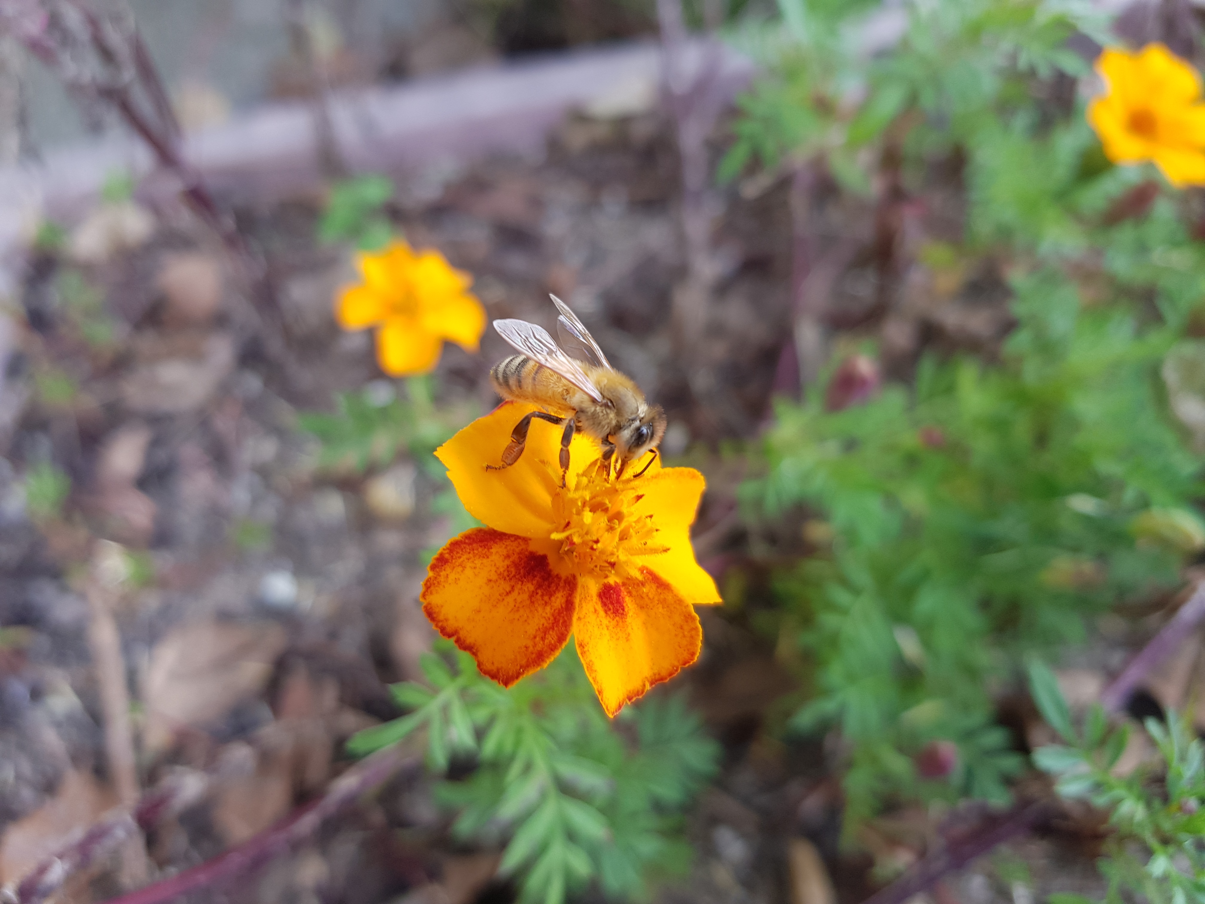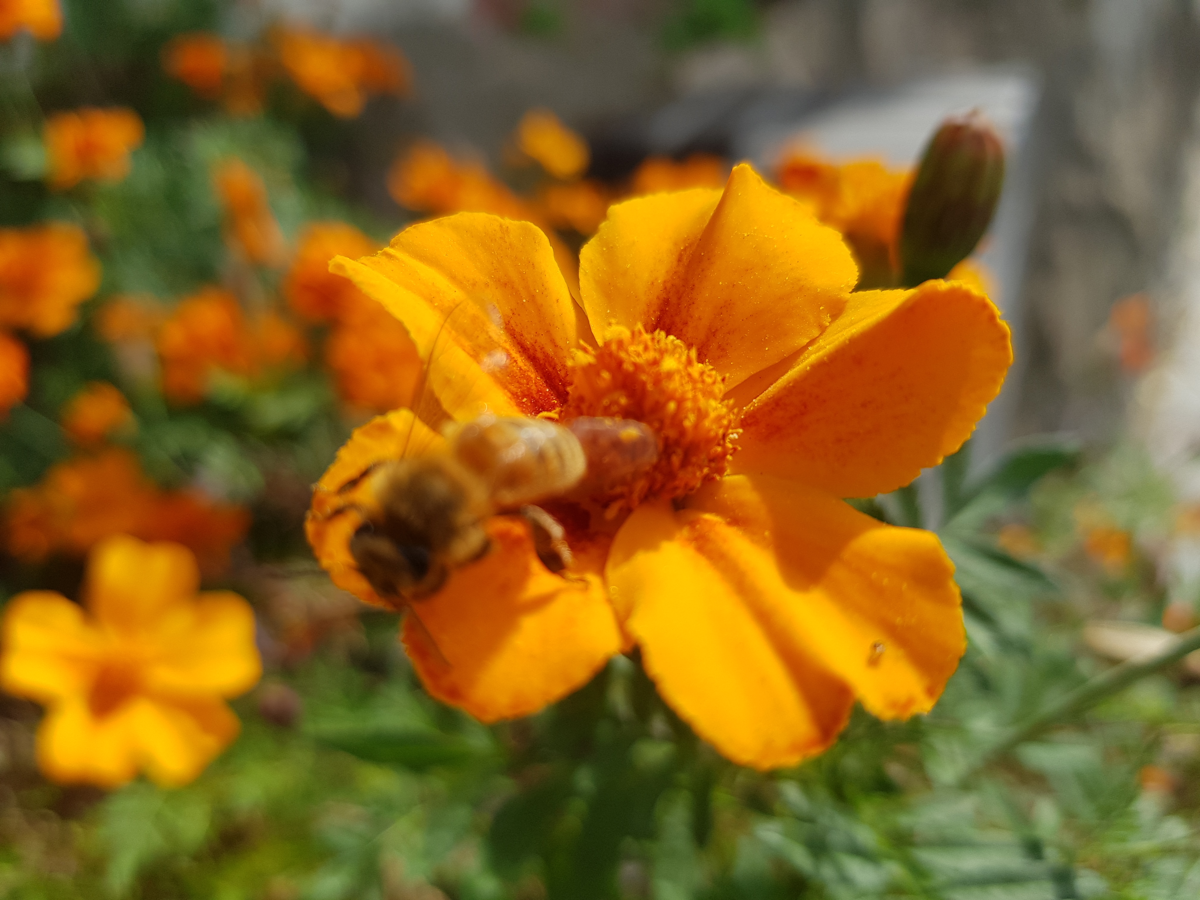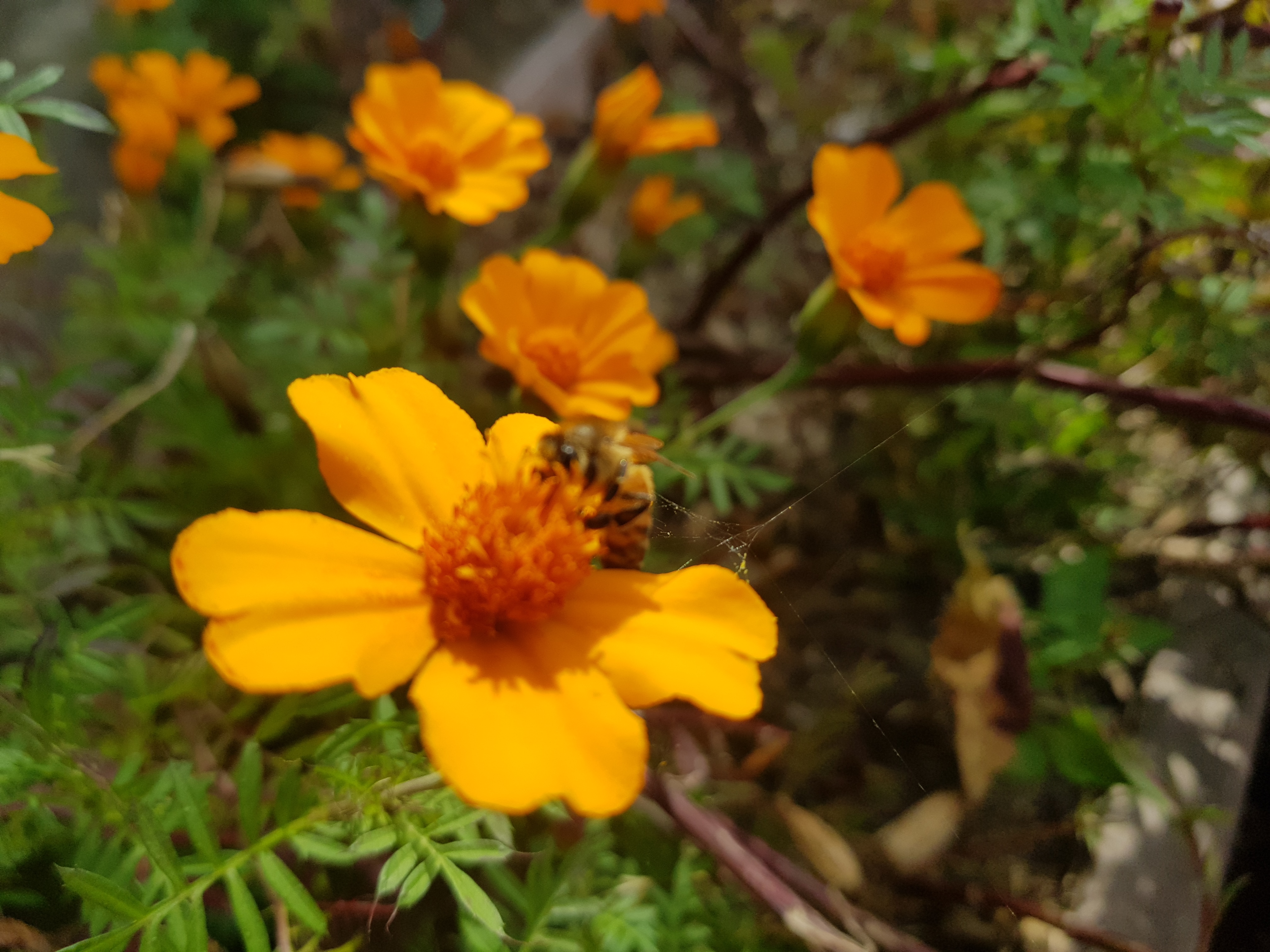 아래 사진은 회사 근처 산책중에 벌들이 주황 코스모스(?) 위에서 바삐 꿀을 따고 있다.-見河-