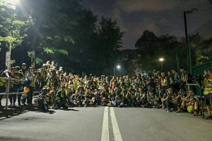 이제 밤 낮도, 요일도 없이-All day all night- 매일이 전쟁 상황인 홍콩, 중문대학교 정문 대치 현장에서 경찰의 진입을 최대한 지연시키겠다며 자리를 지키는 200여 명의 내외신 기자들이 한자리에 모여 사진을 찍었다.