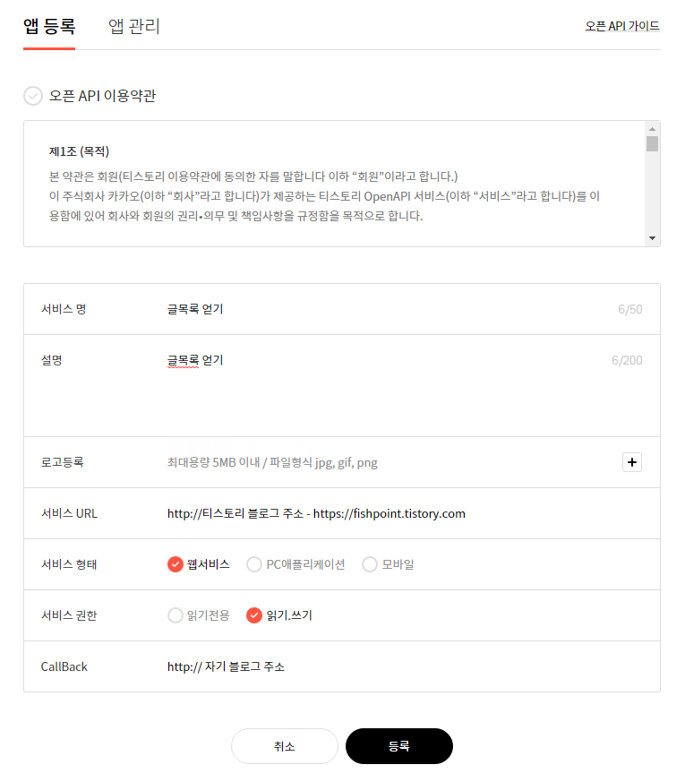 사용자의 앱등록을 하고, 클라이언트 ID와 Secret Key 를 얻어야 한다. 오려운 일이니 아래 사이트로 이동하여 화면을 채운다. 티스토리 open API 등록 사이트