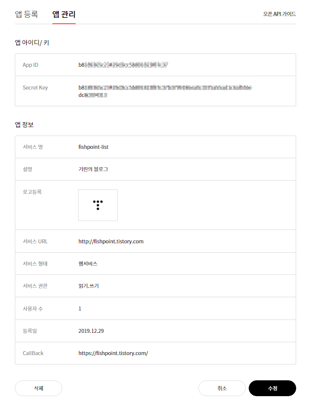 등록을 하고 앱관리 화면으로 이동해 설정화면에 보면 아래 모자이크 저리한 App ID 와 Secret Key가 필요한 자료다.