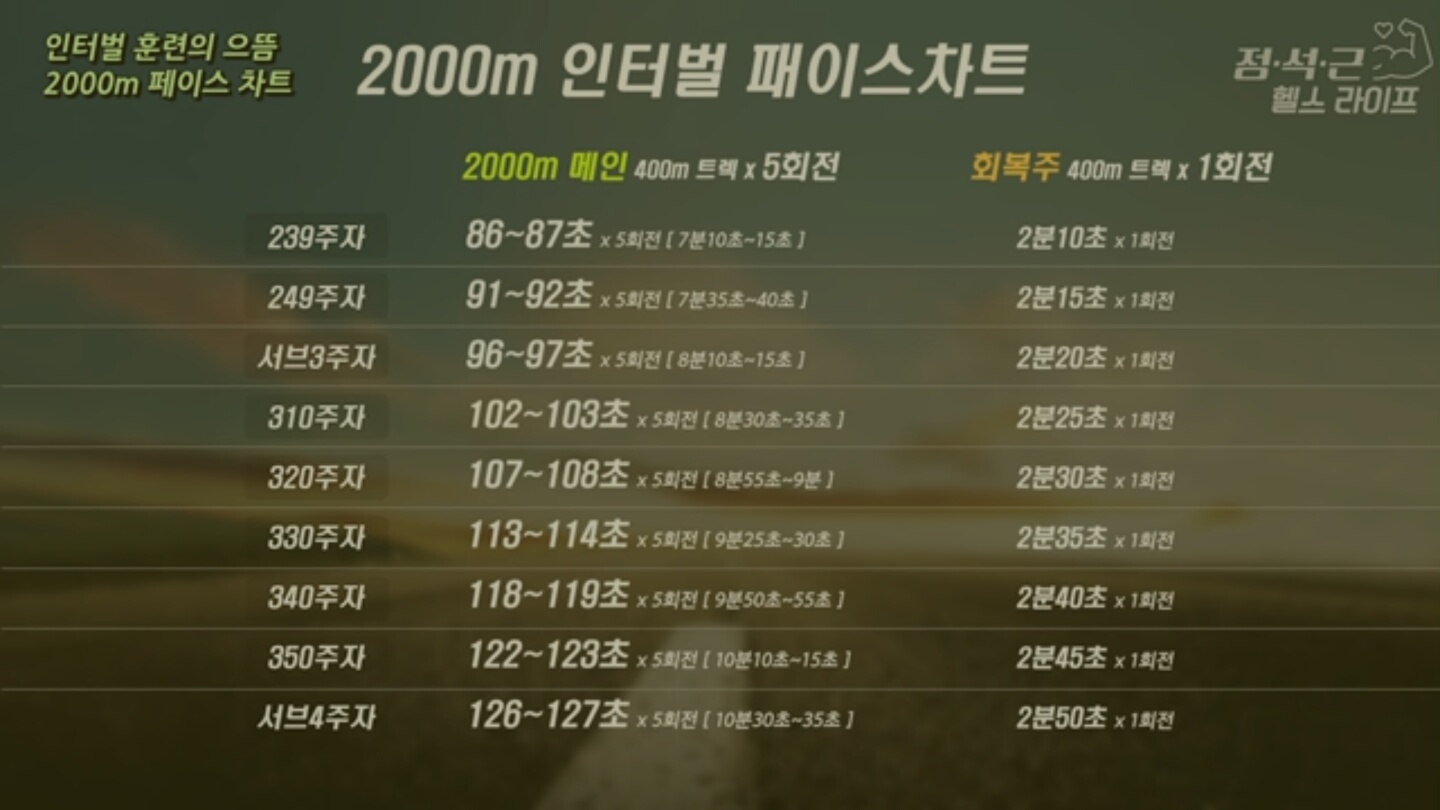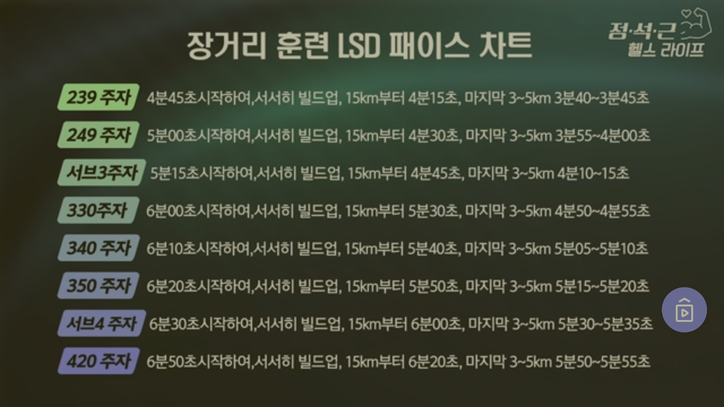 ※ 기록별 장거리 훈련 패이스 : 영상 6:29초에 나옴. 아래 글의 출처도 유튜브에서 퍼옴을 알립니다.