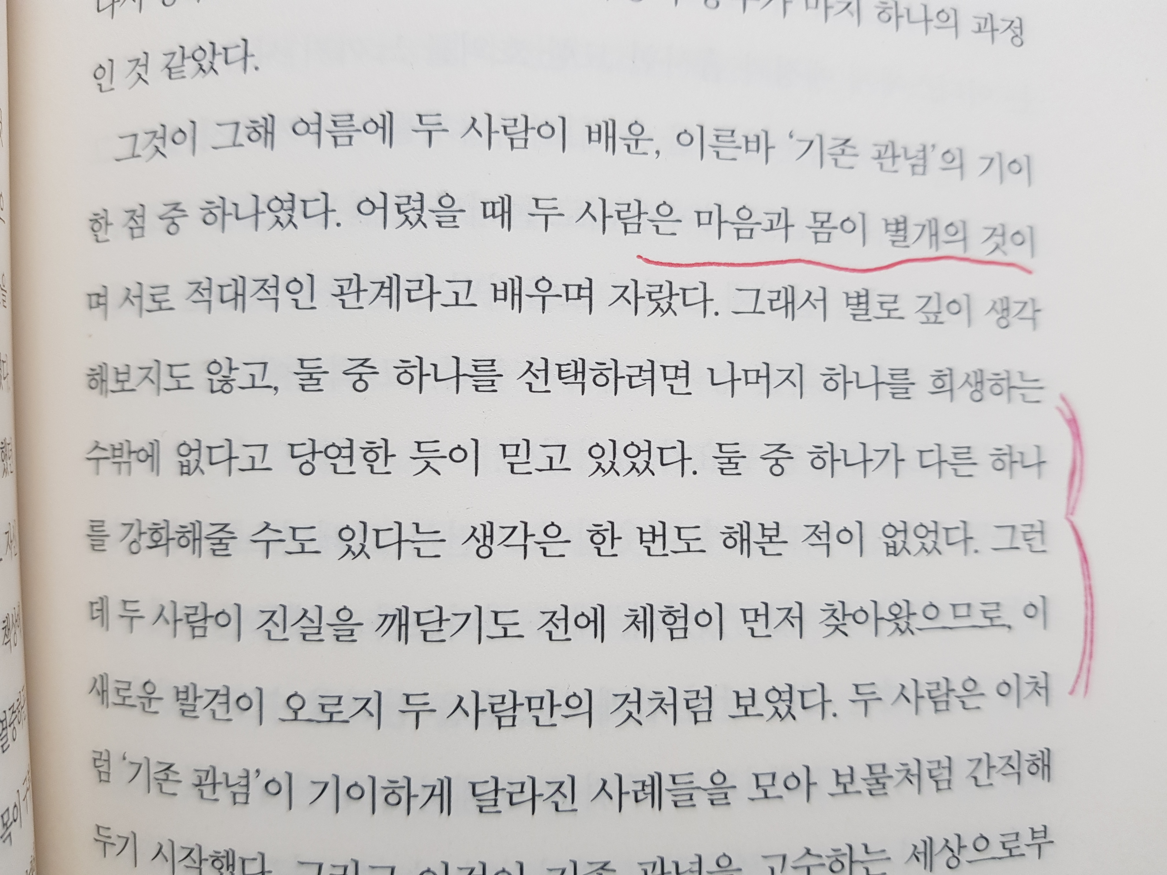 마음만 먹으면 몸에서 의식을 분리시킬 수 있는 것 같았다. 그는 자신을 지켜보았다. 그는 이 일이 고민거리가 되어야 마땅하다는 것을 알고 있었지만 그냥 멍하기만 했다. 이 일이 중요하다고 납득시킬 수 없었다. 이제 마흔 두 살인 그의 앞날에는 즐겁게 여길 만한 것이 전혀 보이지 않았고, 뒤를 돌아보아도 굳이 기억하고 싶은 것이 별로 없었다. p.254