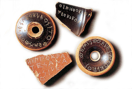 새로운 민주주의 체계가 확립된 아테네에서 폭력을 동원한 처벌을 사용할 수는 없었다. 대신 시민은 자기 이익만을 꾀하는 인물을 처리하기 위한 보다 합리적이고 덜 잔인한 방법을 고안해냈다. 시민은 매년 광장에 모여서 '오스트콘'이라 불리는 사기 조각에 10년 동안 추방하고 싶은 사람 이름을 적어서 투표에 부쳤다. 어떤 사람 이름이 6천 표 이상 나오면 그는 즉시 도시에서 추방되었다. 만일 6천 표를 얻은 사람이 없으면 가장 많은 표가 나온 사람이 추방당했다. 이러한 제도를 오스트라키스모스(ostrakismos, 도편 추방)라고 불렀다. 이러한 투표는 시민에게 일종의 축제와도 같았다. 불안을 조장하고 눈에 거슬리는 인물, 민중에게 봉사하지 않고 시민을 밟고 올라설 기미가 있는 인물을 쫓아내는 일이었으니 얼마나 통쾌했겠는가.