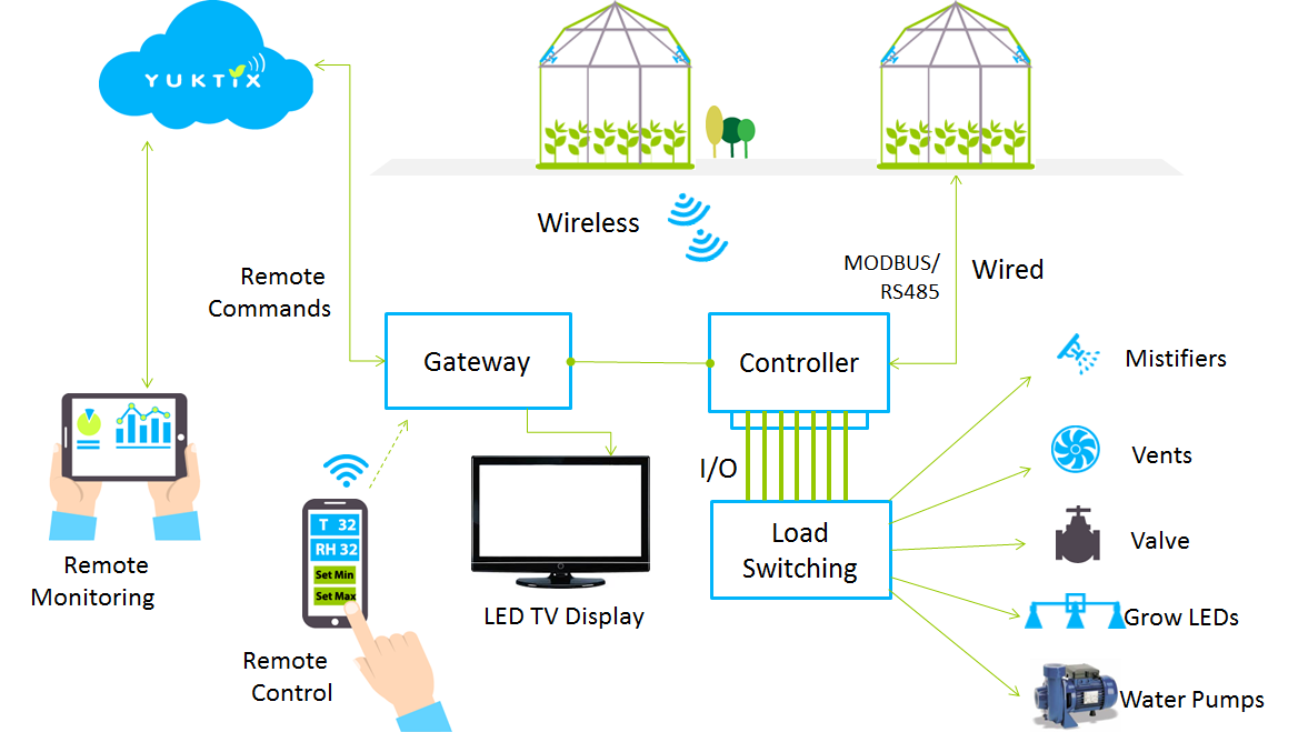 IoT 스마트 농장관리 시스템은 Gateway시스템과 모바일 프로그램으로 구성된다. 농장관리 Gateway는 온습도 센서와 조도 센서에서 수집한 데이터를 Database에 저장하고, 센서 데이터를 판단하여 다양한 액츄에이터(워터펌프, 팬, DC모터, 식물 LED)를 구동한다.