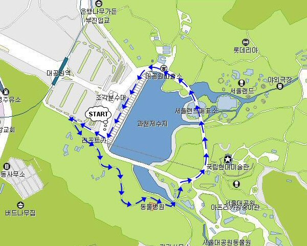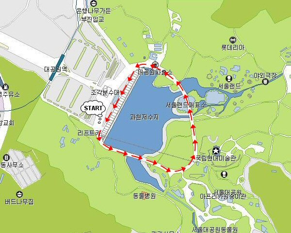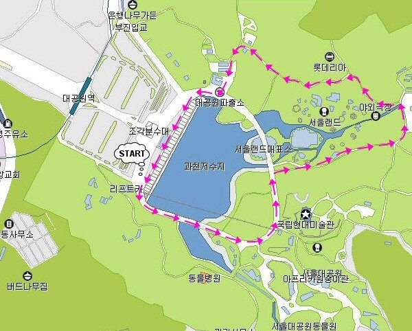 리프트 매표소 - 코끼리열차 호수길 - 리프트 내리는 곳 - 서울랜드 후문 - 약수터 - 검문소 - 대공원 파출소 - 코끼리열차 호수길 코스입니다.