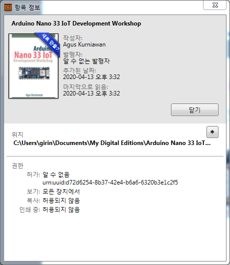 4. 자동적으로 C:\Users\KJM\Documents\My Digital Editions 폴더에, 파일 위치를 모르면 위 그림처럼 항목정보를 클릭해 찾는다. 여기에 pdf 파일이 자동으로 생성되어 있다. (예를 들면 다음 위치: C:\Users\girin\Documents\My Digital Editions 아래)