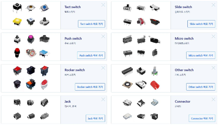 여러가지 부품 판매: Tact Switch, Slide Switch, Push Switch, Micro Switch, Rocker Switch, Other Switch, Switch Cap, Jack, Connector