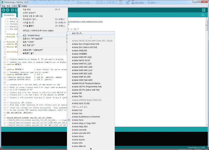 보드 종류와 포트를 선택하십시오 도구> 보드 메뉴에서 Arduino 보드에 해당하는 항목을 선택해야 합니다.