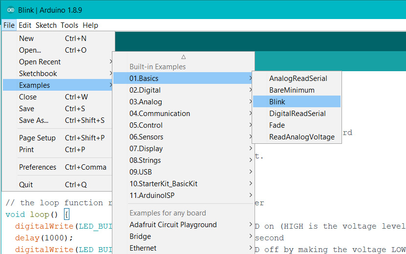 Open your first sketch Open the LED blink example sketch: File > Examples >01.Basics > Blink.