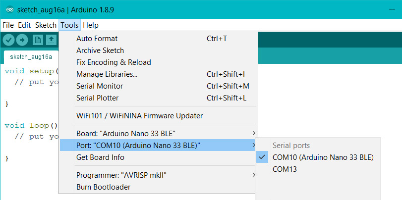 오프라인 상태에서 Arduino NANO 33 BLE Sense를 프로그래밍하려면 Arduino Desktop IDE를 설치하고 Arduino nRF528x mbed Core를 추가해야 한다. 간단한 절차는 Arduino 보드 관리자 페이지에 설명된 대로 도구 메뉴를 선택한 다음 보드 및 마지막 보드 관리자를 선택하여 수행한다. 아래 화면에서 보드 관리자를 선택한다.