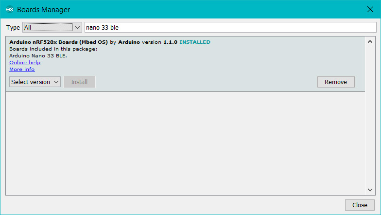 Arduino IDE를 시작하고 도구-> 보드-> 보드 관리자로 이동하여 Arduino 보드 관리자를 시작하십시오. 이제 "Mbed OS"를 검색하고 패키지를 설치하십시오. 설치가 완료되려면 다소 시간이 걸립니다.