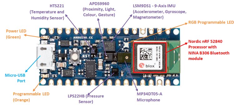 보드의 첫 번째 모습에서 상단에 붐비는 많은 구성 요소를 찾을 수 있습니다. 대부분 내가 앞서 말한 센서입니다. 그러나 주 뇌는 오른쪽의 금속 케이스 뒤에 숨겨져 있습니다. 이 케이스 에는 강력한 Cortex M4F와 BLE 및 Bluetooth 5 통신을 위한 NINA B306 모듈 이 포함된 Nordic nRF52840 프로세서 가 있습니다. 이를 통해 보드는 초 저전력에서 작동하고 Bluetooth 5를 사용하여 통신할 수 있어 홈 오토메이션 및 기타 연결된 프로젝트의 저전력 메시 네트워크 애플리케이션에 이상적입니다. 또한 nRF 프로세서는 ARM Mbed OS를 지원하므로 또한 나중에 논의할 소프트웨어 개선 사항도 제공합니다. 보드에서 알아야 할 센서, LED, 푸시 버튼 및 기타 중요한 사항은