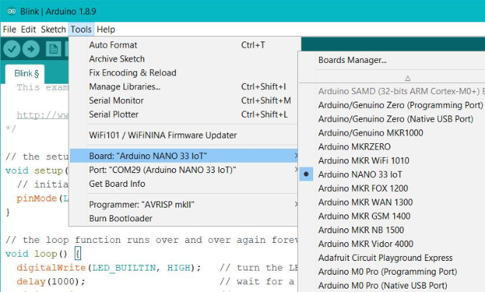 보드를 설치하고 다시 보드 옵션을 확인해보면 Arduino SAMD 하위에 Arduino NANO 33 IoT 보드를 확인할 수 있다. NANO 33 IoT를 선택하여 보드를 설정한다.