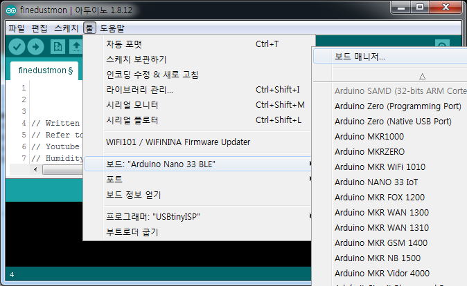 아두이노 실행파일을 열어 메뉴 > 툴 > 보드 > 보드매니저를 실행한다.