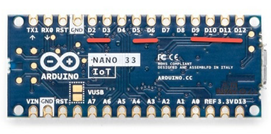 Nano 33 IoT 에서 PWM은 해당 핀을 사용해야 한다. ~ 표시가 있는 디지털핀을 사용한다. ~D2, ~D3, ~D5, ~D6, ~D9, ~D10, ~D11, ~D12. 아래에 PWM 핀을 표시하였다.