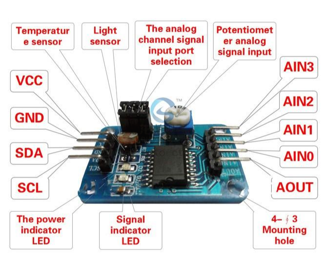 I2C 통신 테스트는 아래 이미지 PCF8951 AD/DA 모듈을 가지고 실습한다.