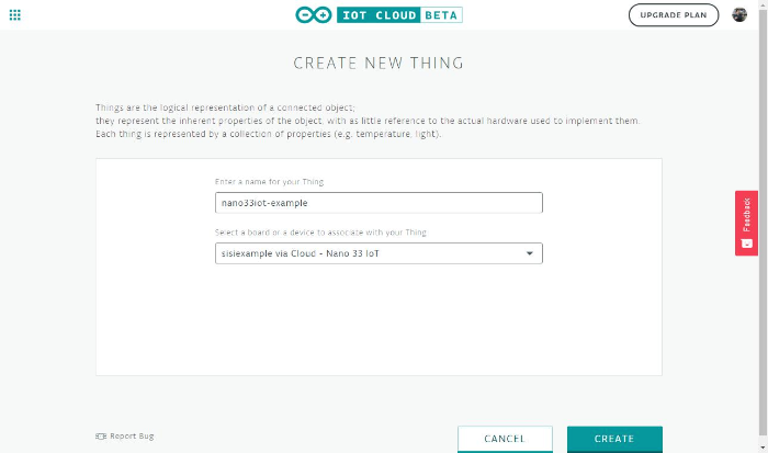 NANO 33 IoT가 올바르게 설정되어 장치 관리자에 추가되었습니다! 이제 Arduino IoT Cloud로 돌아와 Thing을 만들 수 있습니다. 코드에 WiFi 구성 및 ArduinoIoTCloud 라이브러리가 포함되어 있으면 어디에서나 보드를 제어 할 수 있습니다. 위 화면에서 Back to Cloud를 클릭하여 사물관리 화면으로 돌아가서 아까 설정해 준 보드 이름에 대한 사물의 이름을 설정한다.