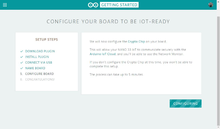 이제 보드에서 Crypto Chip을 구성합니다. 이를 통해 NANO 33 IoT가 Arduino IoT 클라우드와 안전하게 통신 할 수 있습니다 아두 이노 IoT 클라우드 Arduino에서 제공하는이 서비스를 사용하면 모든 네트워크의 네트워크에서 보드와 장치를 제어 할 수 있습니다. 네트워크 모니터를 사용할 수 있습니다. 현재 Crypto Chip을 구성하지 않으면이 설정을 완료 할 수 없습니다. 이 과정은 최대 5 분이 소요될 수 있습니다.