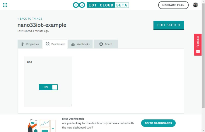 위 코드 한줄을 입력하고 상단의 -> 버튼을 누르고 자신의 Nano 33 IoT 보드에 프로그램을 업로드한다. 약 5분 정도 걸리면 성공이라는 메세지가 상태창에 출력된다. 웹 화면의 모니터로는 출력이 보이지가 않는다. 왜냐하면 대쉬보드의 스위치에 변경이 있을 때 LOW 문자가 출력되도록 되어 있으니 웹상에서 보여주는 것은없다, 업로드가 끝났으면 처음 화면으로 돌아가 대쉬보드를 클릭한다.