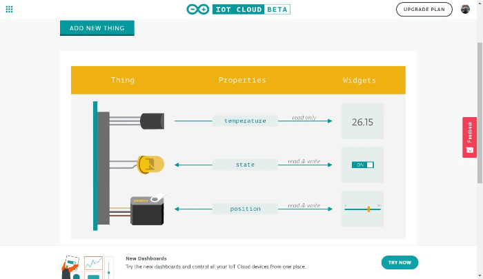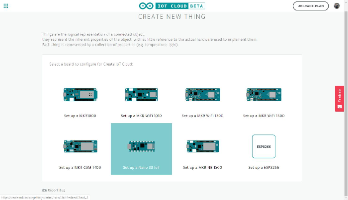 Add New Thing을 클릭해 아두이노 클라우드에 연결할 수 있는 다양한 보드제품이 나온다. Things(사물)은 연결된 개체의 논리적인 표현입니다. 사물은 개체의 특정 속성을 나타내며, 이를 구현하기 위해 사용되는 실제 하드웨어에 대한 참조는 거의 없습니다. 다른 말로 말하면 하드웨어에 대한 지식이나 정보가 하나도 없다고 해도 사물 자체의 속성을 다룸으로 사물을 정의할 수 있게 됩니다. 각 사물은 속성 컬렉션(온도, 빛 등)으로 표시됩니다.