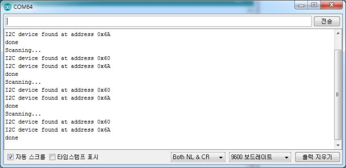 컴파일하여 업로드 합니다. 시리얼 모니터를 열어 스캔 결과를 확인합니다.
