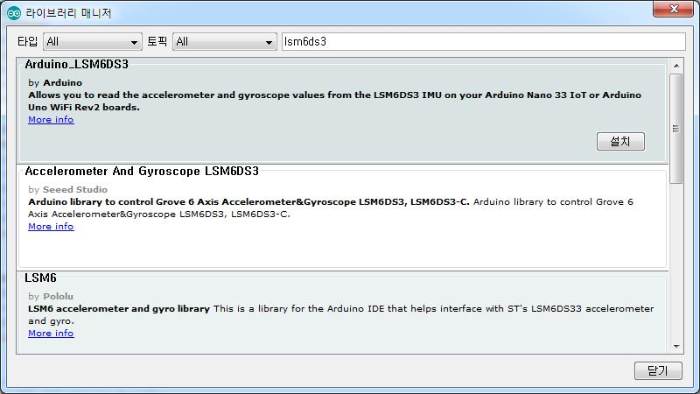 아두이노 스케치 -> 툴 -> 라이브러리 관리 하면으로 가서 아래와 같이 LSM6DS3를 검색하여 라리브러리를 설치한다.