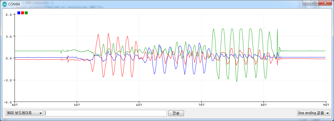 아래는 최신 버전의 스케치 도구에서 제공하는 툴 메뉴의 시리얼 플로터를 열어 본 그림입니다. 가로, 세로, 상하로 흔들었을 때의 결과값과 X, Y축 좌표들을 확인할 수 있습니다. 씨리얼 플로터 사용에 대한 자세한 설명은 아래 링크를 참고하기 바랍니다.
