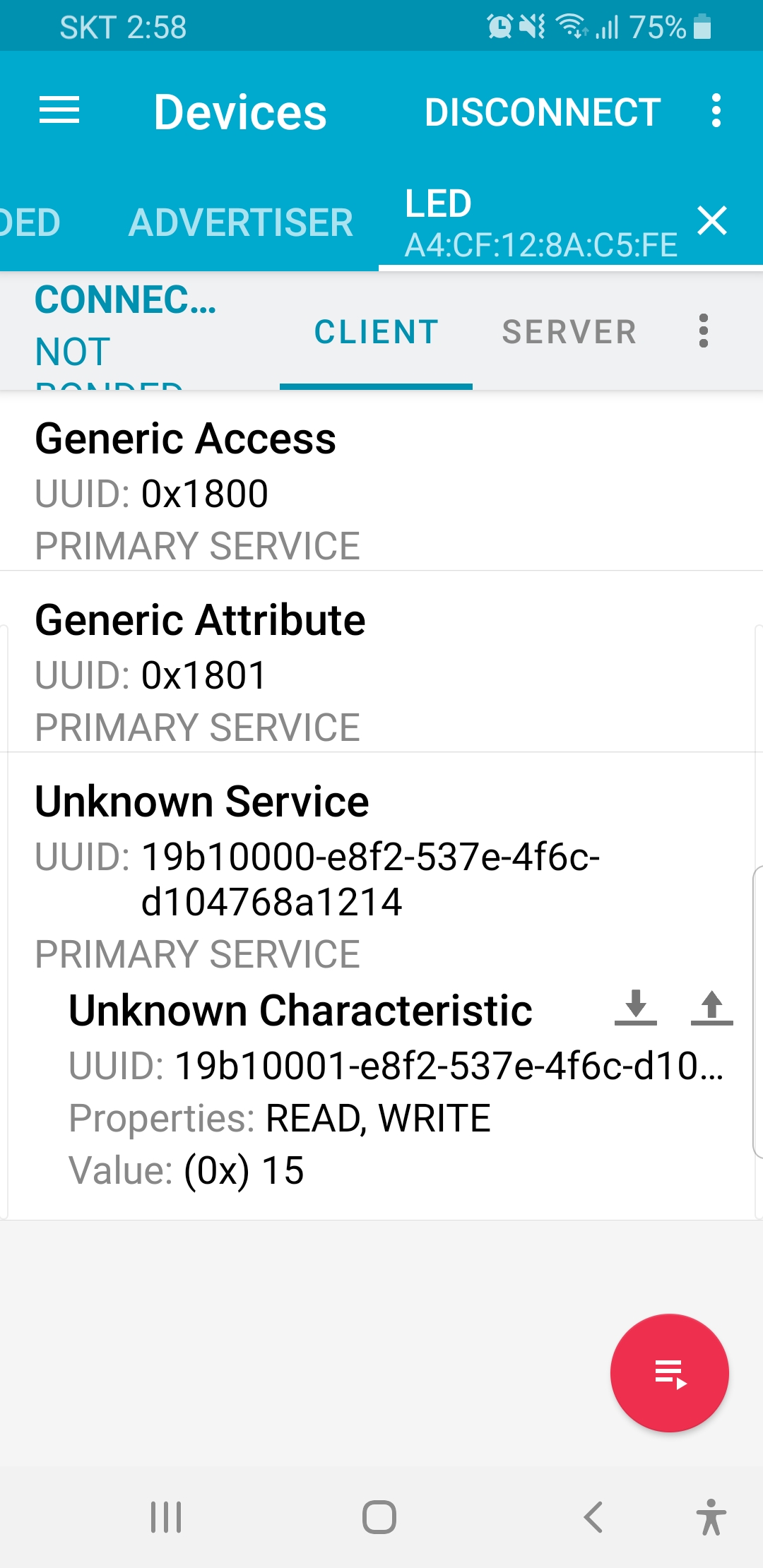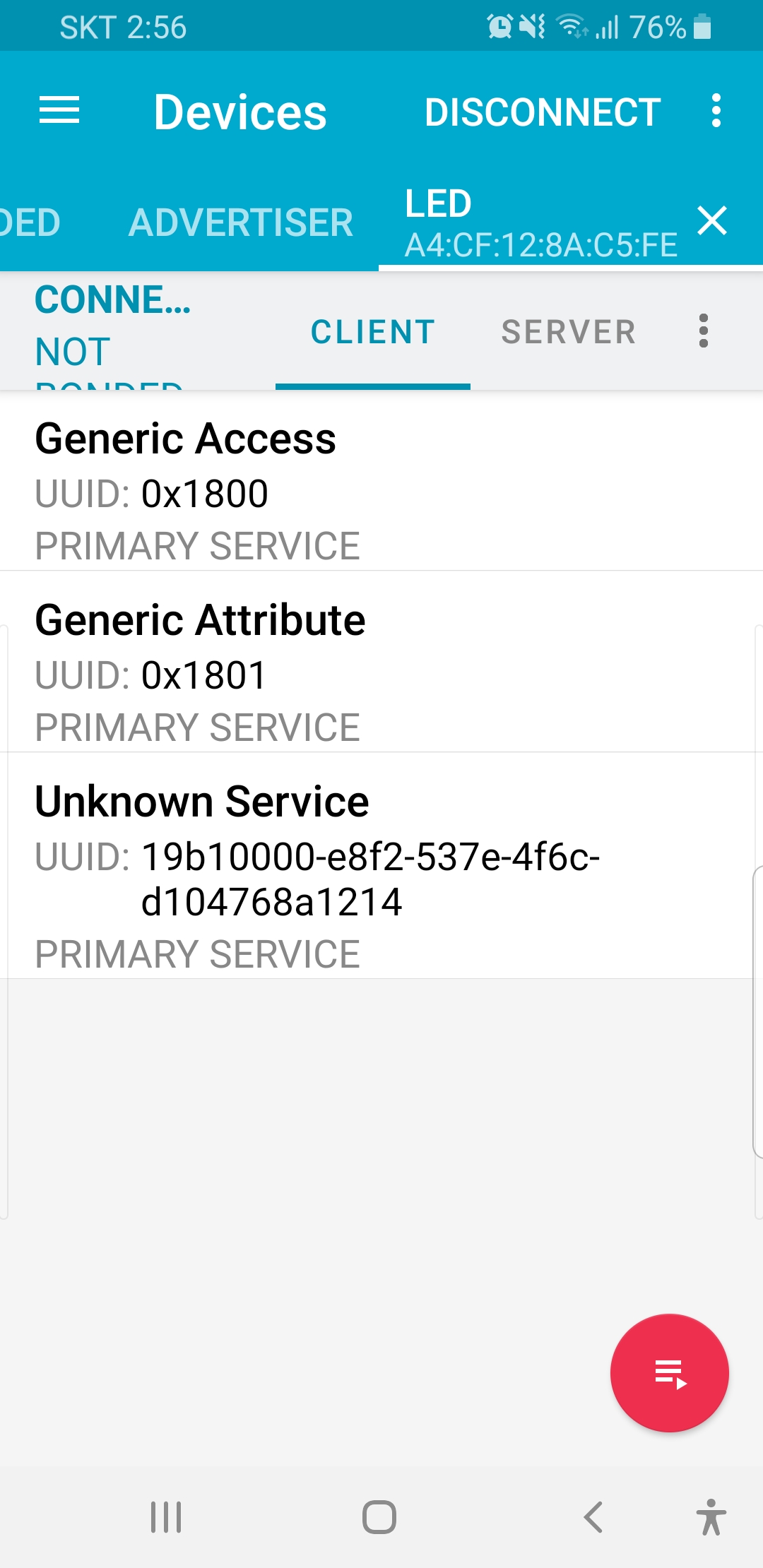 스마트 폰에 앱을 설치하고 아래 화면을 따라 테스트 한다. 블루투스를 인에이블 시키고 스캔을 하면 LED 가 보인다. 연결을 한다.