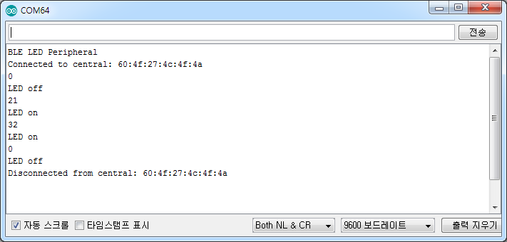 서비스 아래 위를 클릭하여 값을 0 이나 0 이상으로 넣어 보낸다. 시리얼 모니터에 LED on, off 상태가 표시됨을 확인한다.