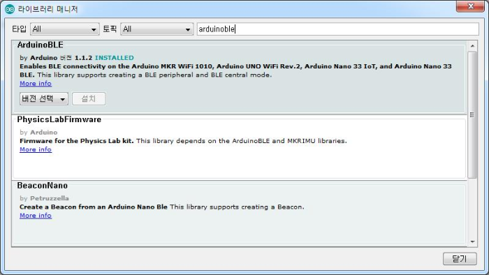 스케치-> 라이브러리 포함-> 라이브러리 관리 메뉴를 클릭하여 ArduinoBLE 라이브러리를 추가 할 수 있습니다. 그런 다음 대화 상자가 나타납니다. 검색 텍스트 상자에 ArduinoBLE을 입력하면 ArduinoBLE이 표시됩니다. 아래 그림을 참고하여 라이브러리를 설치하십시오.