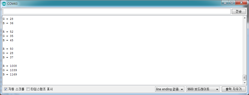 아래 1,000이 넘어가는 수는 감지하지 못한 데이터고 빨간색이나 검은색을 보드 위에 대면 정확한 RGB 값이 출력되는 데이터를 확인할 수 있다.