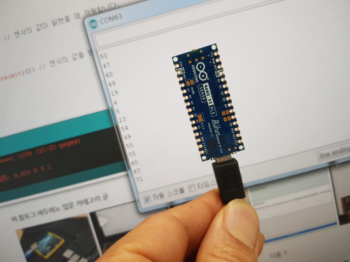 보드 앞에 물체를 대고 출력 결과를 확인한다. 0 은 너무 가깝고 250 이상은 측정 불가고, 그 사이 값이 적당한 거리임을 알려준다.
