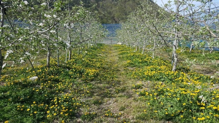 열매를 맺는 꽃의 수정은 보통 벌이나 나비가 해줘야 하는데 요즘은 벌 개체수가 너무 부족하니까 과수농가서는 양봉하는 집에 가서 꿀벌통을 사 온다. 여왕벌 빼고 일벌만 한통에 8만 원이다. 이 꿀벌은 수명이 얼마나 될까? 충분한 기간을 살 줄 알았는데 고작 3일이다. 다행히 꿀벌이 장수하면 1주일 가는 경우도 있다. 꽃이 적색으로 물든 후에는 벌을 풀어놔야 하는데, 이때가 그린카펫인 사과나무 통로와 나무 아래에 민들레꽃이 피는 시기와 겹친다.