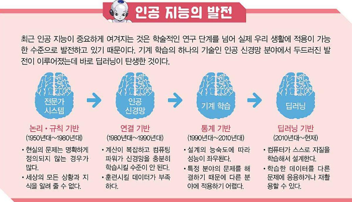 • 1990~2010: 과학적 방법론의 도입, 신경망(1986)과 머신러닝 연구, 베이지안넷(1988)과 확률적 추론 연구, 지능형 에이전트(1995)와 로보컵 대회(1997)