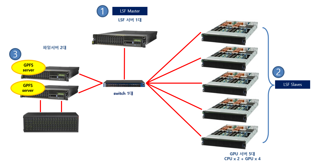 - LSF Master 서버에 접속 하여 LSF Scheduler를 통해 GPU 노드(5대)에 job할당