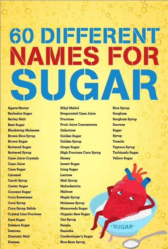 아가베 시럽, 흑설탕, 옥수수 감미료, 옥수수 시럽, 덱스트로스, 과당, 과일주스 농축액, 액상 과당, 고과당 시럽, 꿀, 전화당, 맥아당, 락토스, 말토스, 메이플 시럽, 원당 혹은 조당, 당밀, 수크로스