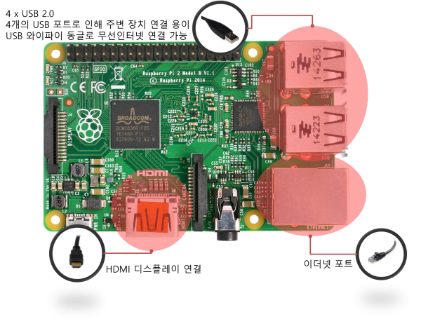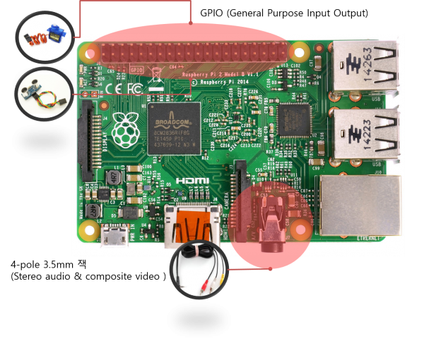 ○ 40 핀 GPIO (입출력, 통신 포트) 다음은 라즈베리 파이 2 Model B의 구성품 사양을 그림으로 나타내었다. (이미지 출처 : 메이크 셰어 http://makeshare.org/)