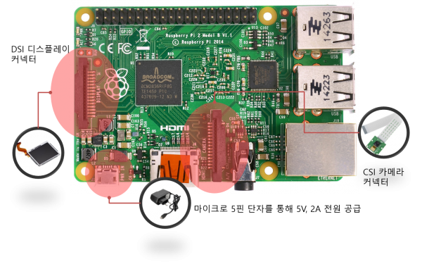 ○ SoC (시스템온칩): Broadcom BCM2836 (CPU, GPU, DSP, SDRAM, USBport)