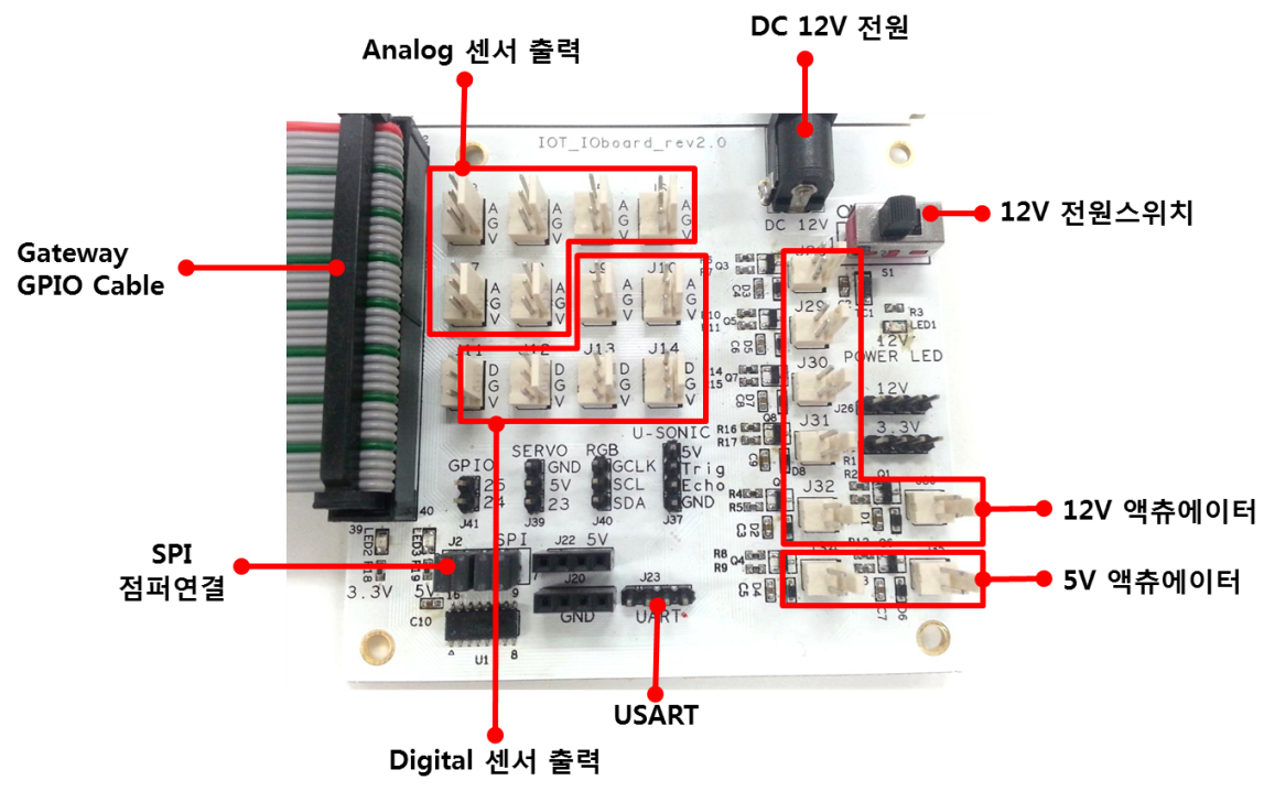 센서로부터 센서값을 수집하거나 액츄에이터 제어하는 기능은 라즈베리 파이에 40 pin GPIO 케이블에 연결된 IO 보드를 통해서 수행한다. IO 보드는 센서 입력 전원(DC 3.3V, DC 5V)과 출력(ananlog, digital)을 갖는 여러 가지 센서들을 연결할 수 있도록 만든 회로 기판이다. 또한 IO 보드는 구동 전원(DC 5V)으로 무접점 릴레이를 제어하여 외부 액츄에이터의 전원을 제어하는 역할을 수행한다.