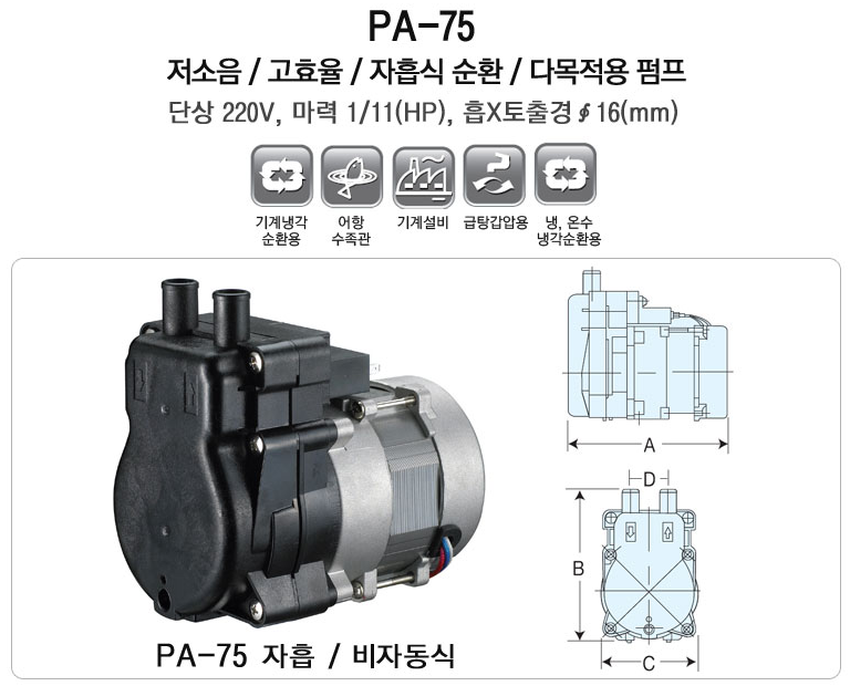 Greenhouse 원격관리시스템에서 사용하는 워터펌프는 한일전기 다목적 순환펌프 PA-75 모델을 사용한다. 워터펌프의 특징은 아래와 같다.