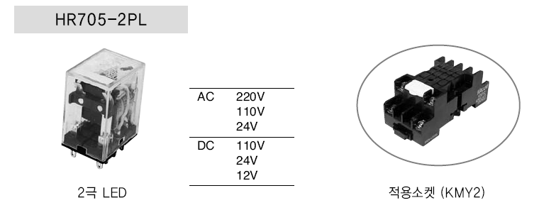실제 사용제품은 대치 가능한 릴레이 성은 전자의 MY-2SL 8핀 릴레이며 두 개의 접점(2 Pole)을 가지고 있다. 아래 이미지의 SMY 품명은 MY 품명과 동일하다. 외관 이미지와 상세 Specification 은 아래와 같다.