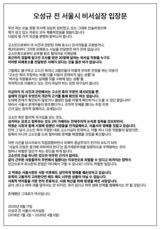 "현재 진행 중인 고 박원순 시장 관련 상황을 보고 있다. 착잡하고 안타까운 마음으로 지켜보는 대부분 사람은 박원순 전 시장과 개인적 친분이 있었을 리도 없고, 그의 지지자도 아닌 사람도 많다. 그럼에도 불구하고 그의 죽음에 너무도 가슴 아팠던 건, 나와 동년배 이상의 진보진영의 사람이라면 누구나 그의 삶과 인간 됨됨이를 모를 수 없는 세월을 함께 지나왔기 때문일 것이다. 어쭙잖은 나부랭이들이 깐족대는 꼴이 분노스럽다 이 말이다." -출처 모름