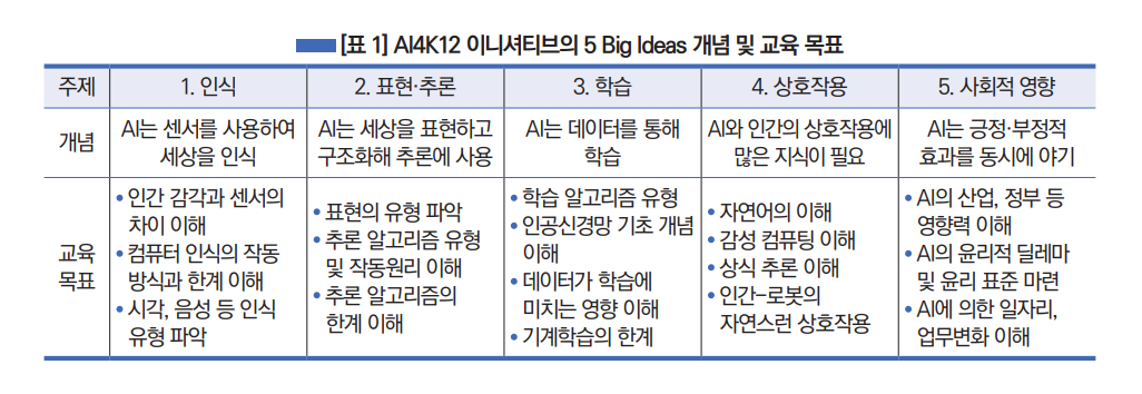 이들이 제안한 5 Big Ideas는 인공지능을 이해하기 위해 필요한 5대 학습 분야를 정의하고 학령별 수준에 따른 교육 목표와 내용을 제시하였다.
