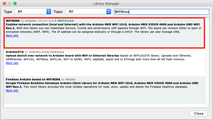 Arduino IDE에 공식 라이브러리를 설치하려면 Tools-> Manage Libraries ... 메뉴로 이동합니다. 라이브러리 관리자에서 WifiNINA를 검색하고 Arduino by WiFiNINA를 설치합니다.