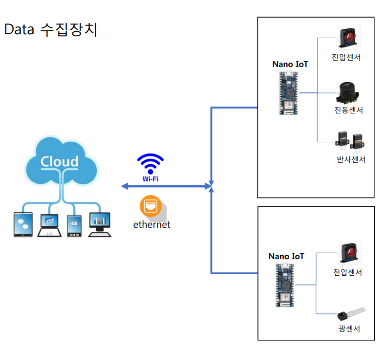 이미 설치된 장비는 약간이라도 손을 대지 않고 작업합니다. 장비에서 나오는 신호, 예를 들면 소리, 진동, 이동하는 물체로부터 센싱 데이터를 뽑아내고 실내의 온도와 습도를 클라우드로 전송합니다. 서버단에서 데이터를 받는 부분은 구현하지 않고 여기서는 마이크로 프로세서 기능만 구현합니다.