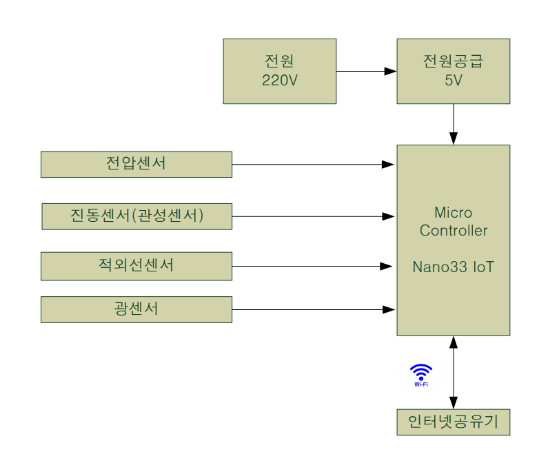 Visio를 사용하여 그린 블록도를 첨부합니다. 구성품 상세 기능이나 전원 규격 부분, 센서 파트 넘버와 같은 상세 설명은 아직 적지 않았습니다. 나중에 구현하며 추가할 생각입니다.