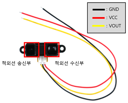거리 측정 센서는 센서와 물체 사이에 거리를 측정하는 센서입니다. 측정하려는 물체로 적외선을 송신하고 물체에 반사되어 돌아오는 시간을 계산하고 이를 통해 거리를 알 수 있는 센서입니다. 적외선 거리 측정 센서는 수신부로 측정되는 적외선의 아날로그 세기를 측정하여 출력하기 때문에 VCC, GND, VOUT로 총 3개의 핀으로 구성되어 있습니다.