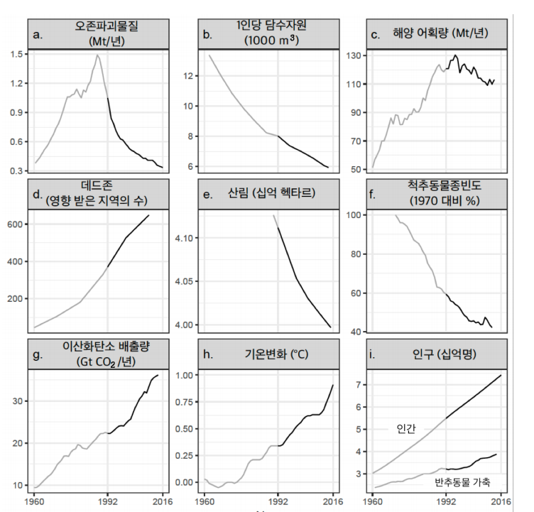 패널 (a)는 연간 자연 배출량이 0.11Mt CFC11 인 것으로 가정하고 성층권 오존을 고갈시키는 할로겐 소스 가스의 배출량을 보여준다.패널 (c)에서 1990년대 중반 이후 해양 어획량은 감소했지만 동시에 어획 노력이 진행되고있다 (보충 파일 S1). 패널 (f)의 척추 동물빈도수는 분류학적 및 지리적 편향에 맞춰 조정되었지만 개발 도상국에서는 상대적으로 적은 데이터가 통합되었다.1970년과 2012년 사이에 척추 동물은 58%감소했으며 담수,해양 및 육상 개체수는 각각 81%,36%및 35%감소했다. (파일 S1). 패널 (h)에 5 년 평균이 표시되어 있다. 패널 (ⅰ)에서, 반추 동물은 가축, 양, 염소 및 버팔로로 구성된다.y축은 0 에서 시작하지 않으므로 각 그래프를 해석 할 때 데이터 범위를 확인하는 것이 중요하다.1992년 이후 각 패널의 변수에 대한 백분율 변화는 다음과 같다 :(a)-68.1%;(b)-26.1%;(c)-6.4%;(d)+75.3%;(e)-2.8%;(f)-28.9%;(g)+62.1%;(h)+167.6%;(i)인간 :+ 35.5%,반추 동물 :+ 20.5%.변수 및 추세에 대한 추가 설명과 그림 1 의 소스는 파일 S1 에 포함되어 있다